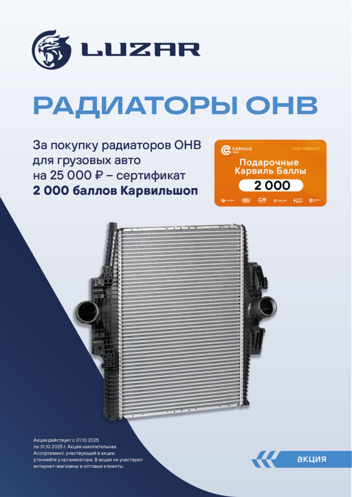 За покупку радиаторов OHB для грузовых авто на 25 000р. – сертификат 2000 баллов Карвильшоп