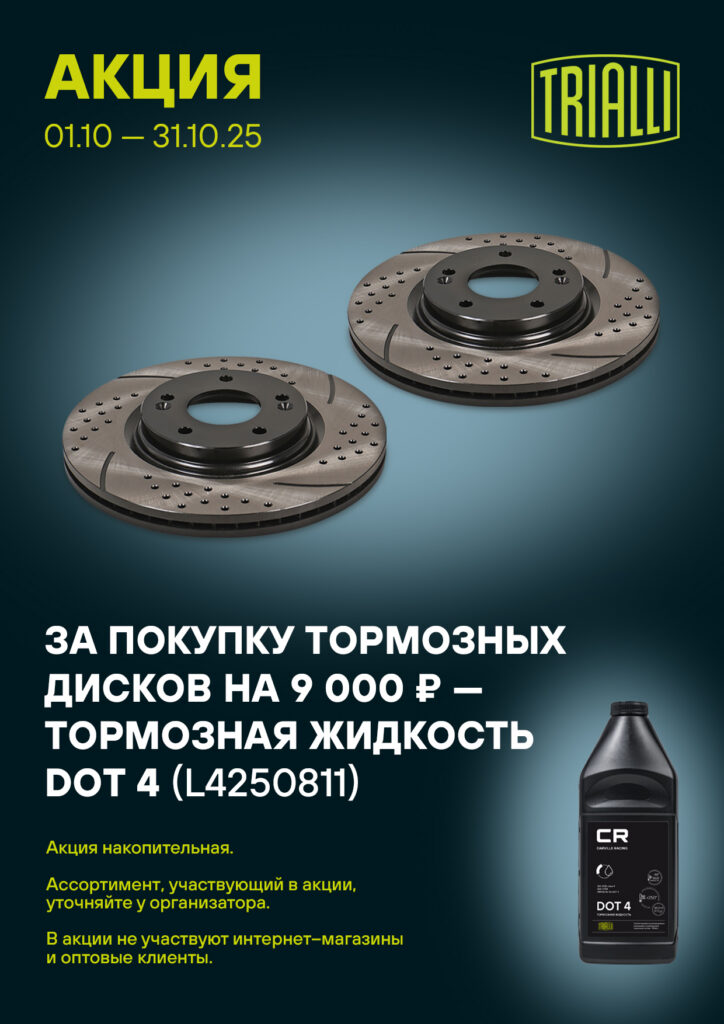 Условия акции: За покупку тормозных дисков на 9 000р. – тормозная жидкость DOT 4 (L4250811)