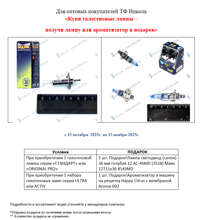 *Подарки суммируются, т.е, например, при покупке 3 наборов – 3 ароматизатора в подарок, при покупке 2 ламп – 2 лампы в подарок