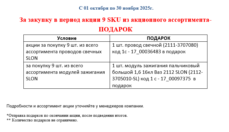 1. В период проведения акции за покупку 9 шт. из всего ассортимента проводов свечных SLON в отчетном периоде, клиент получает 1 шт. провод свечной (2111-3707080)
