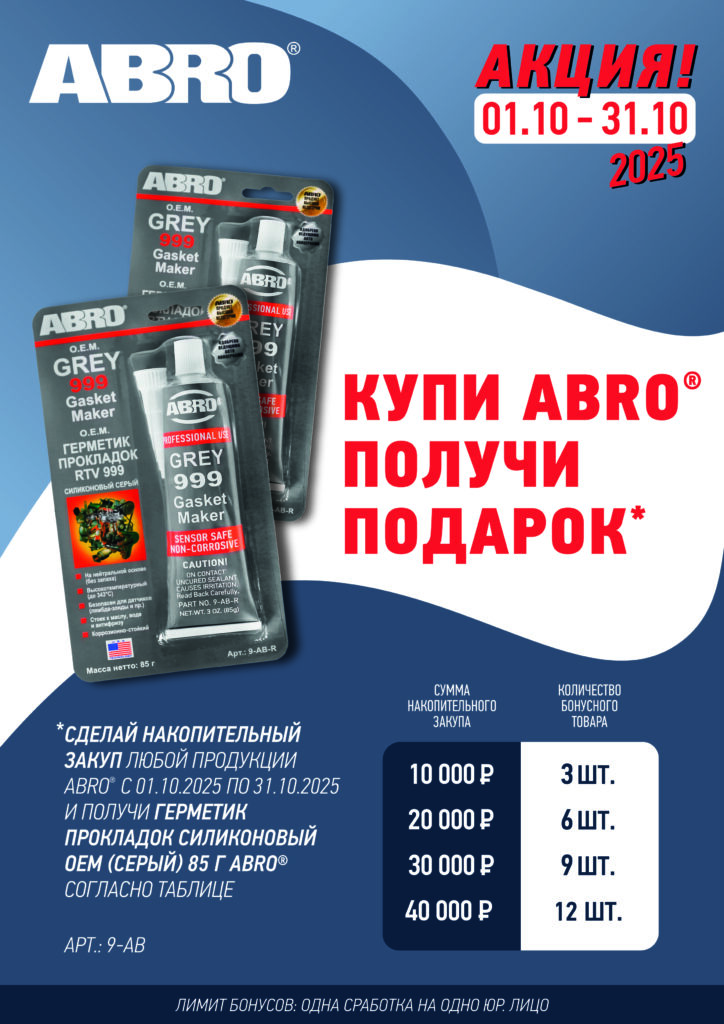 При закупке в течение периода акции любой продукции ABRO на сумму не менее 10 000 рублей получат ПОДАРОК согласно таблице: