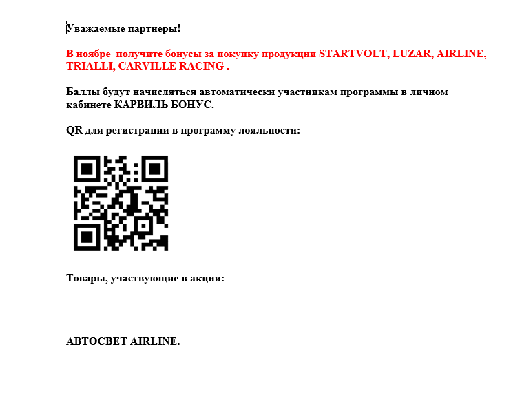 В ноябре бонусы за покупку продукции LUZAR, AIRLINE, TRIALLI, CARVILLE RACING .